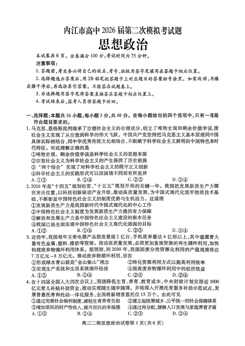 内江市高中2026届第二次模拟考试题 政治.pdf