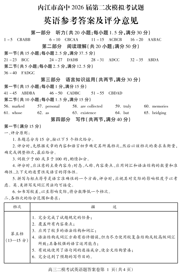 内江市高中2026届第二次模拟考试题 英语答案.pdf