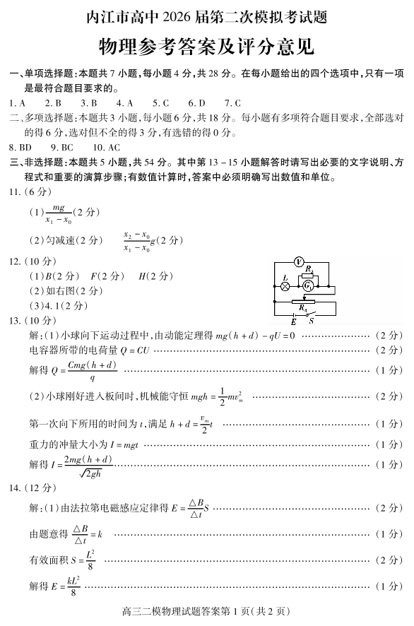 内江市高中2026届第二次模拟考试题 物理答案.pdf