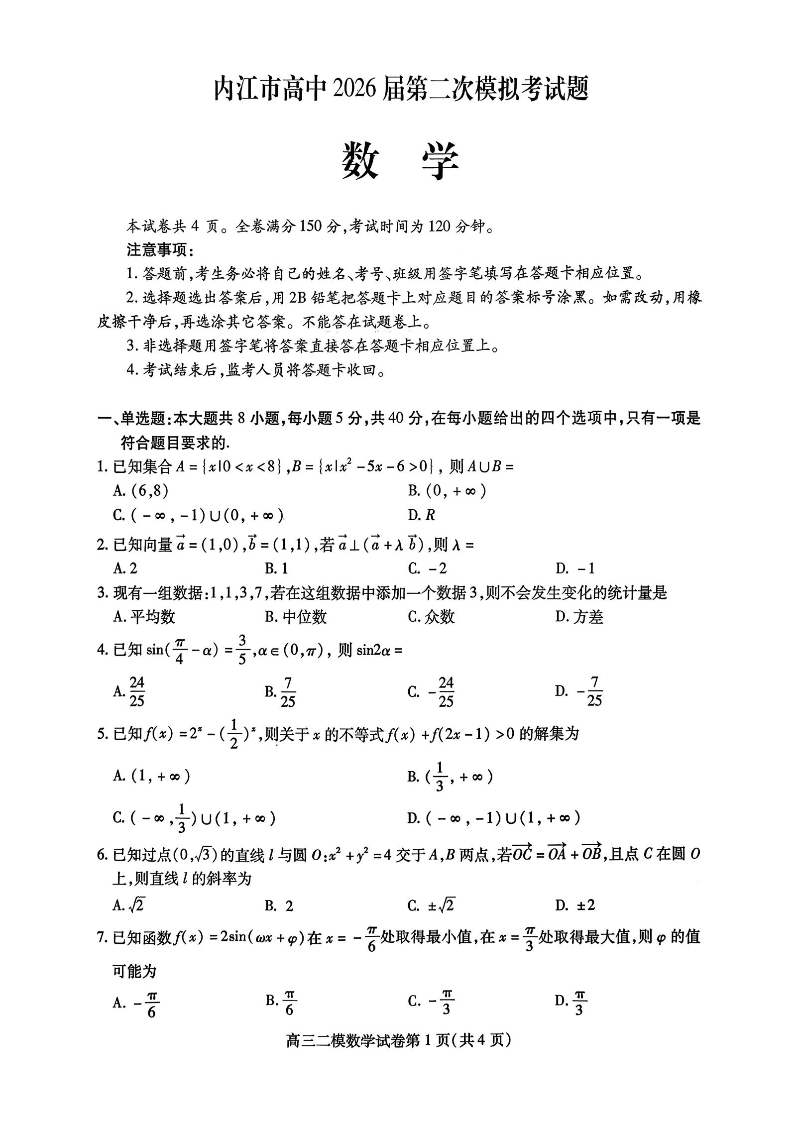内江市高中2026届第二次模拟考试题 数学.pdf