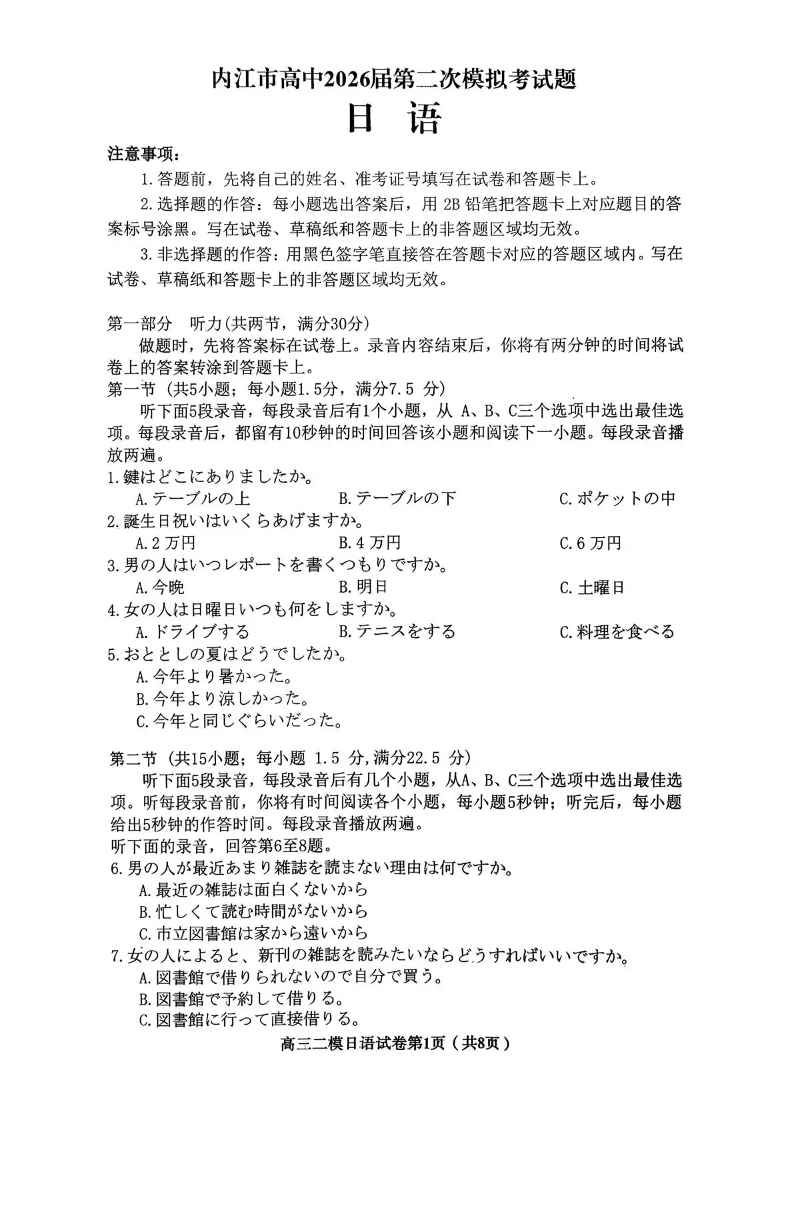 内江市高中2026届第二次模拟考试题 日语.pdf