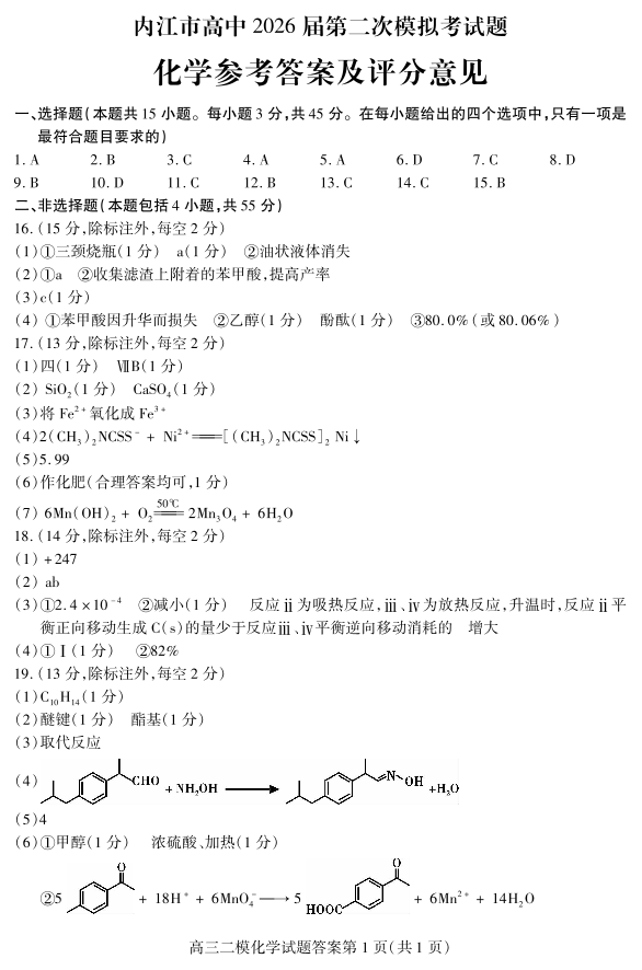内江市高中2026届第二次模拟考试题 化学答案.pdf