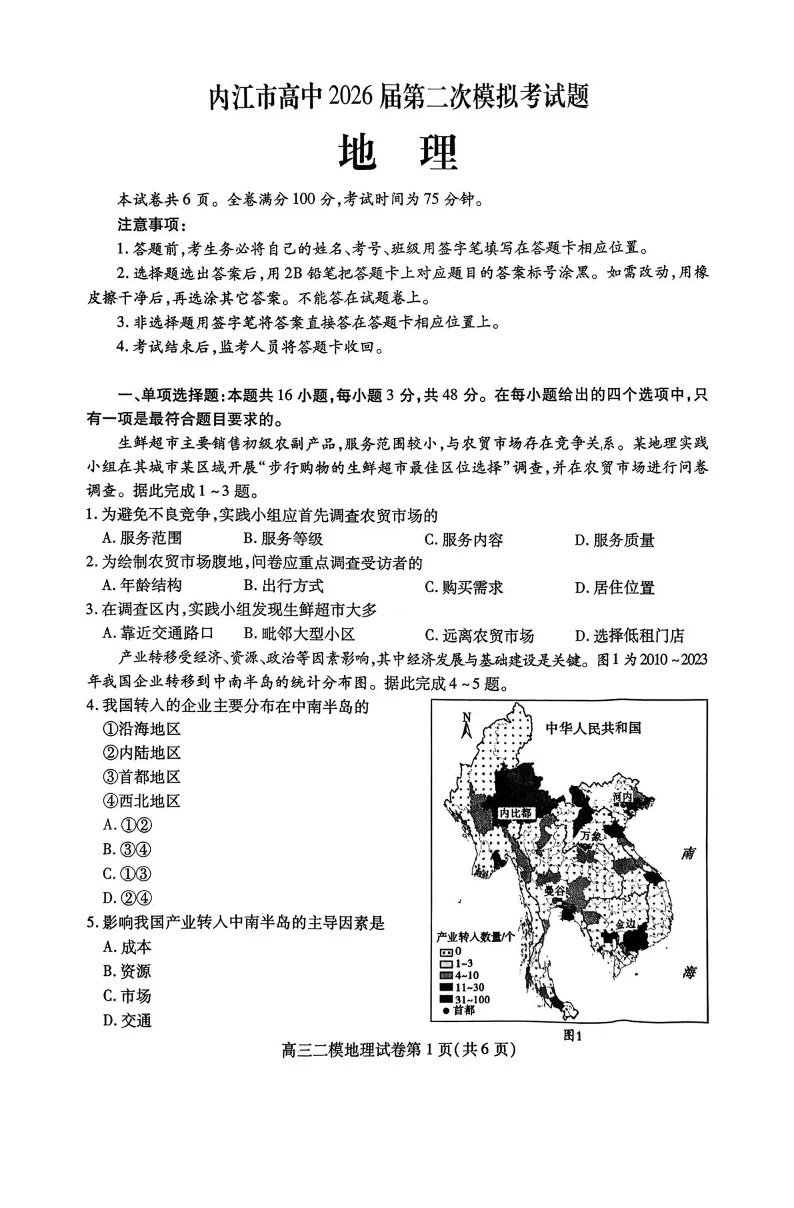 内江市高中2026届第二次模拟考试题 地理.pdf