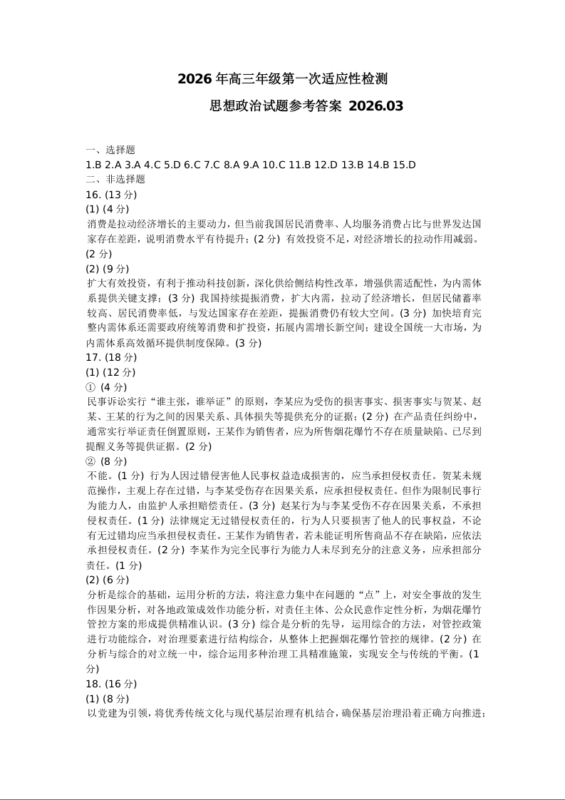 青岛市2026年高三年级第一次适应性检测 政治答案.docx