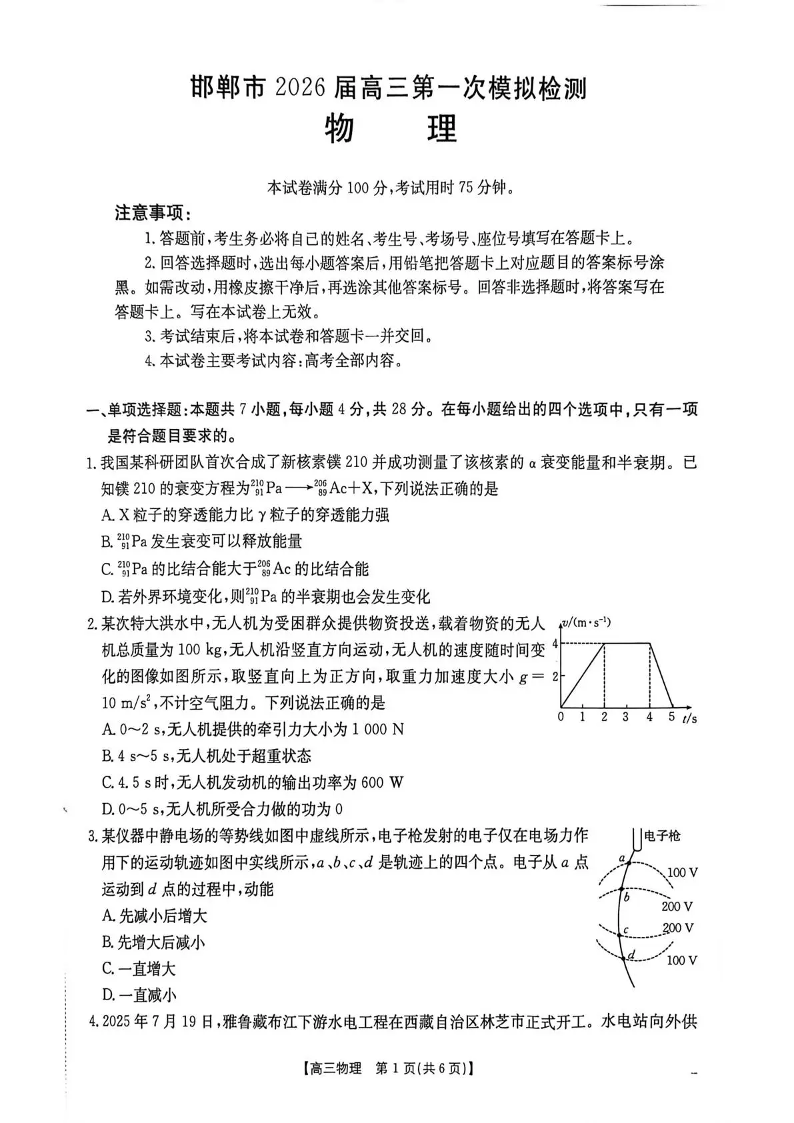 邯郸市2026届高三第一次模拟检测 物理.pdf