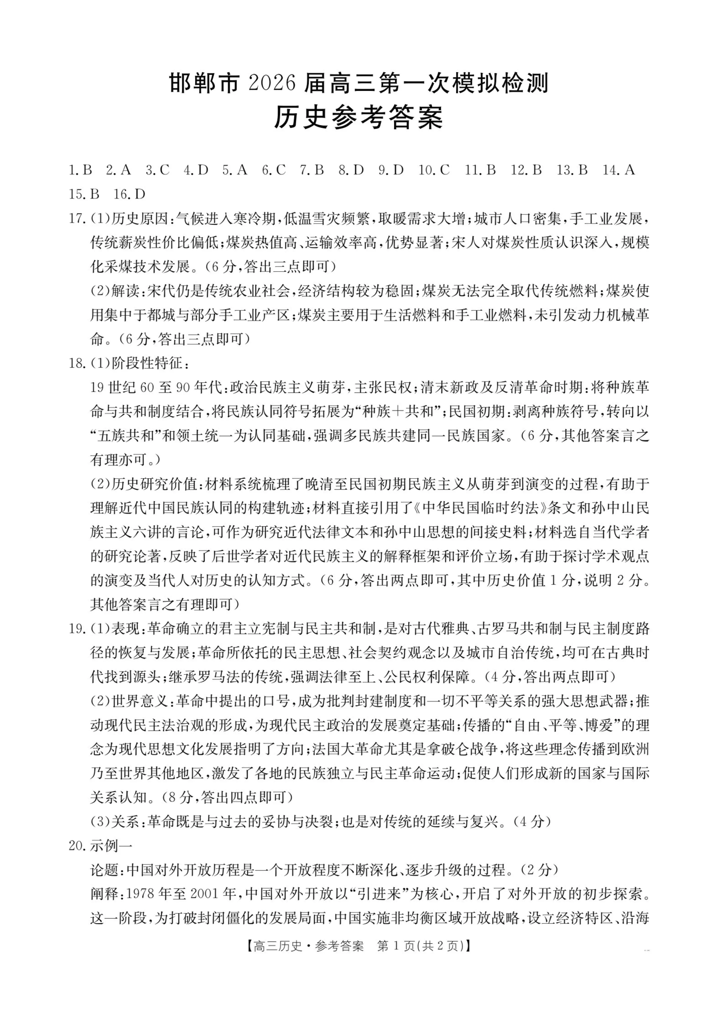 邯郸市2026届高三第一次模拟检测 历史答案.pdf