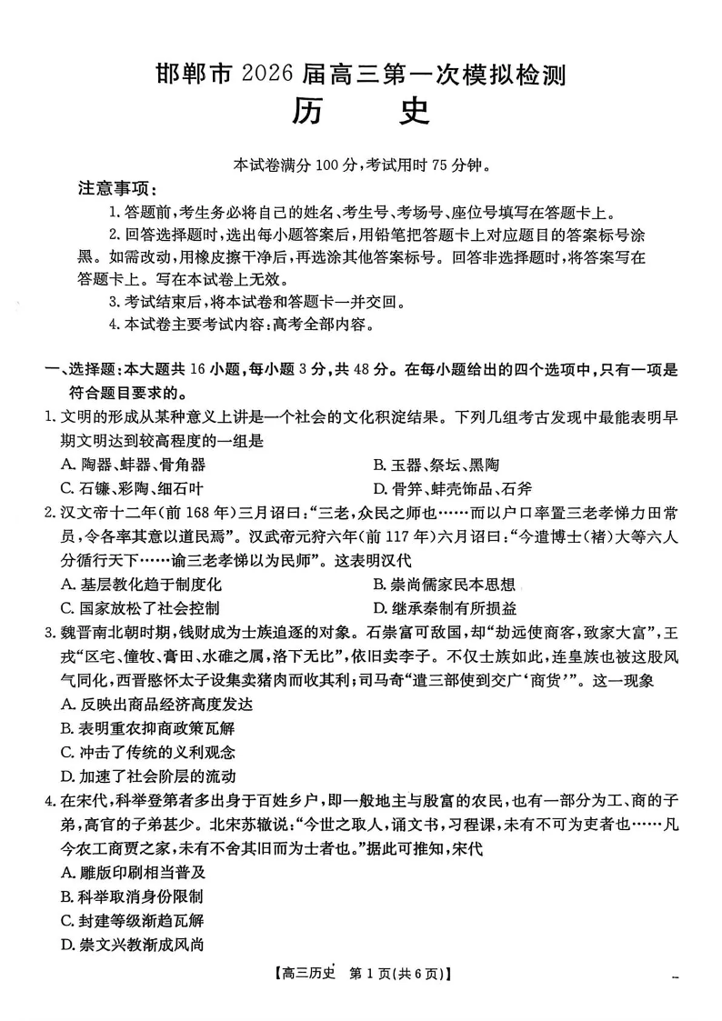 邯郸市2026届高三第一次模拟检测 历史.pdf