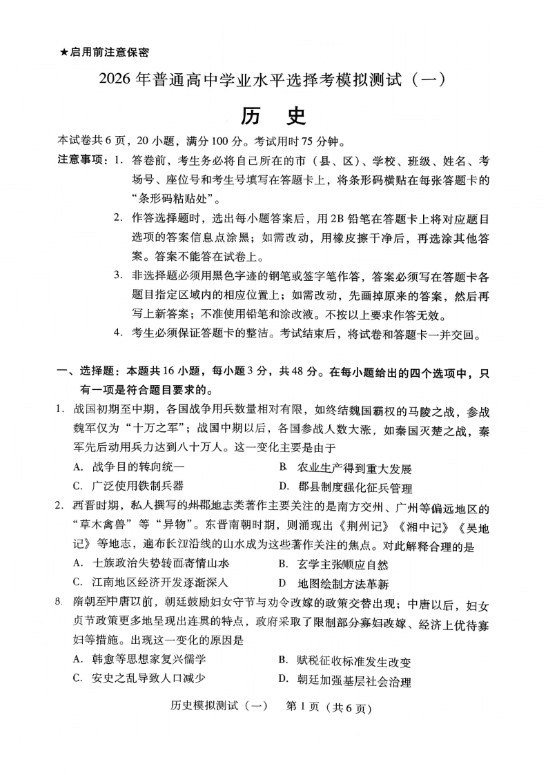 广东省2026年普通高等学校招生全国统一考试模拟测试(一)历史.pdf