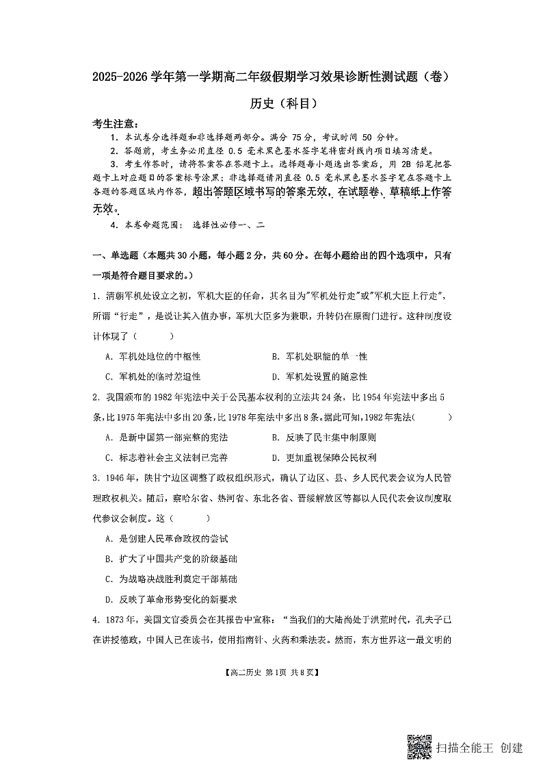 山西省阳泉市2025-2026学年高二第二学期开学检测 历史.pdf