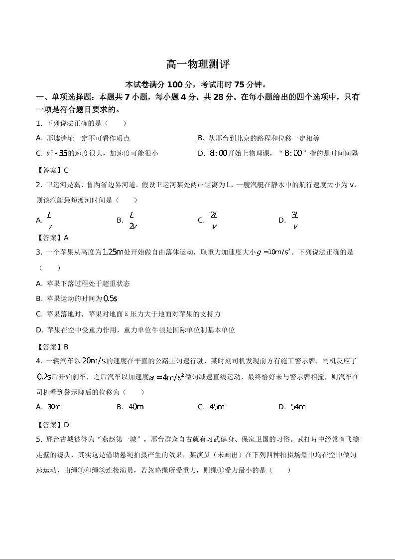 河北省邢台市卓越联盟2025-2026学年高一下学期开学测评 物理试题(含答案).docx