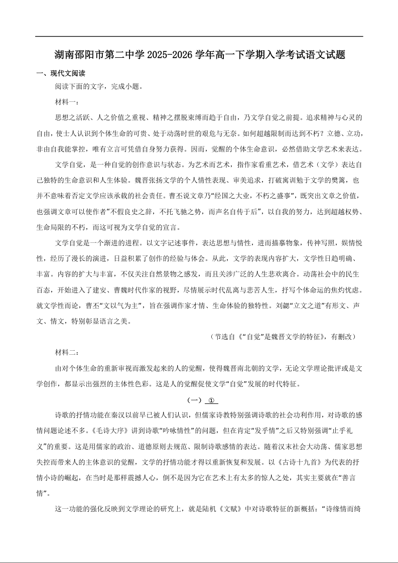 湖南省邵阳市第二中学2025-2026学年高一下学期入学测试 语文试题(含答案).docx