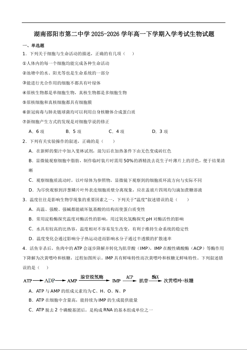 湖南省邵阳市第二中学2025-2026学年高一下学期入学测试 生物试题(含答案).docx