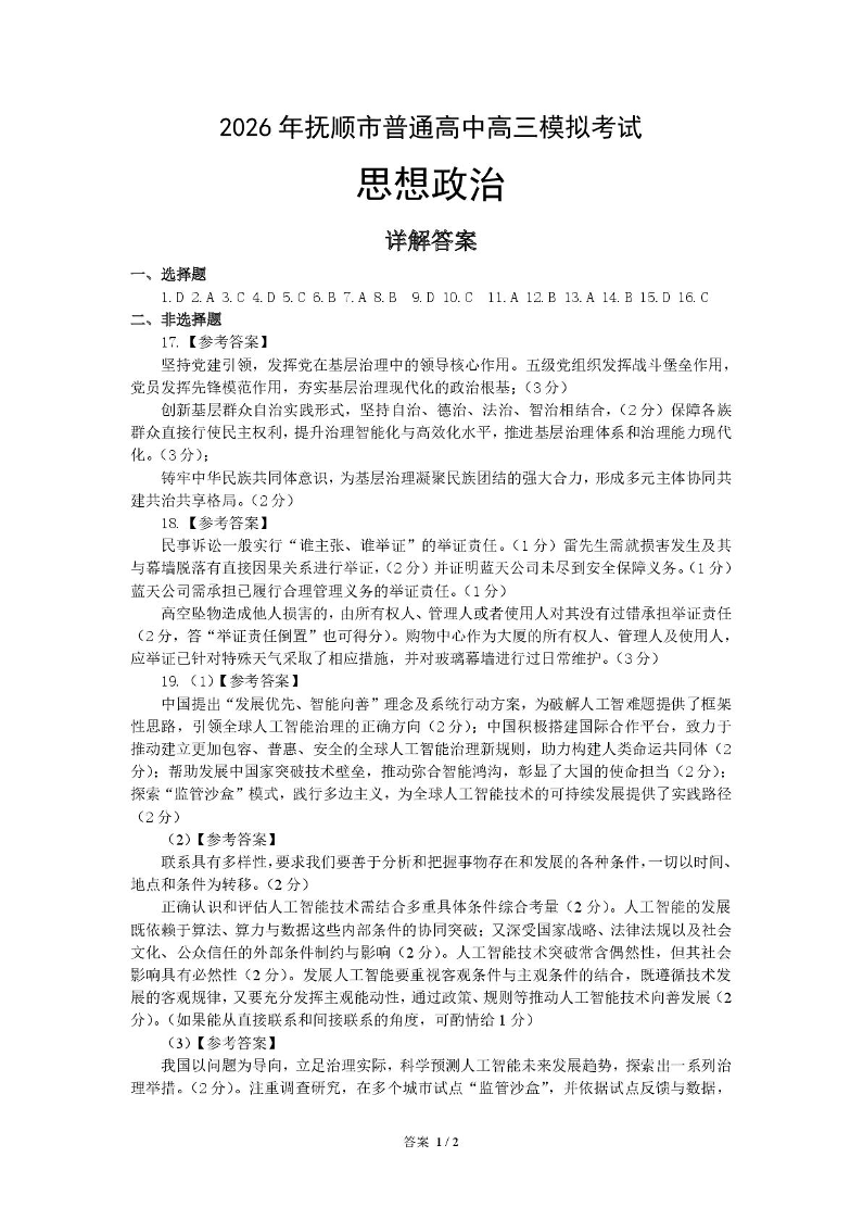 2026年抚顺市普通高中应届毕业生高考模拟考试 政治答案.pdf