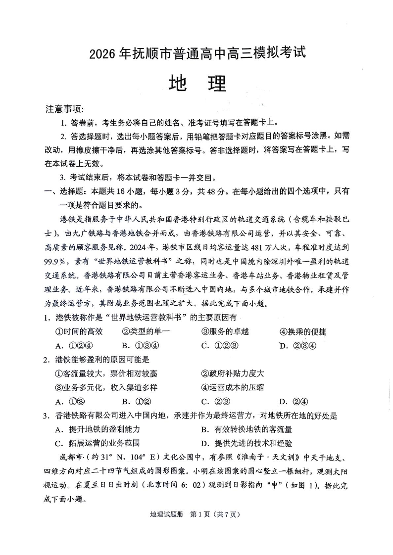 2026年抚顺市普通高中应届毕业生高考模拟考试 地理.pdf
