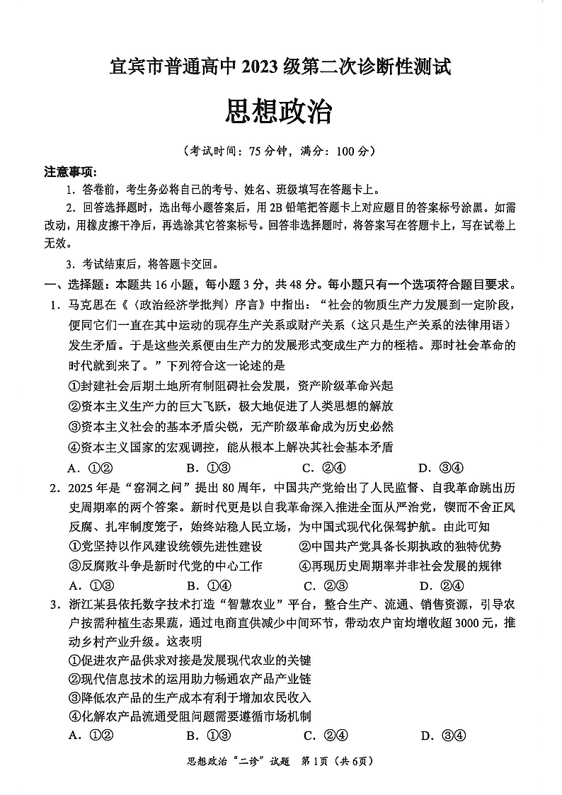 宜宾市普通高中2023级第二次诊断性测试 政治.pdf