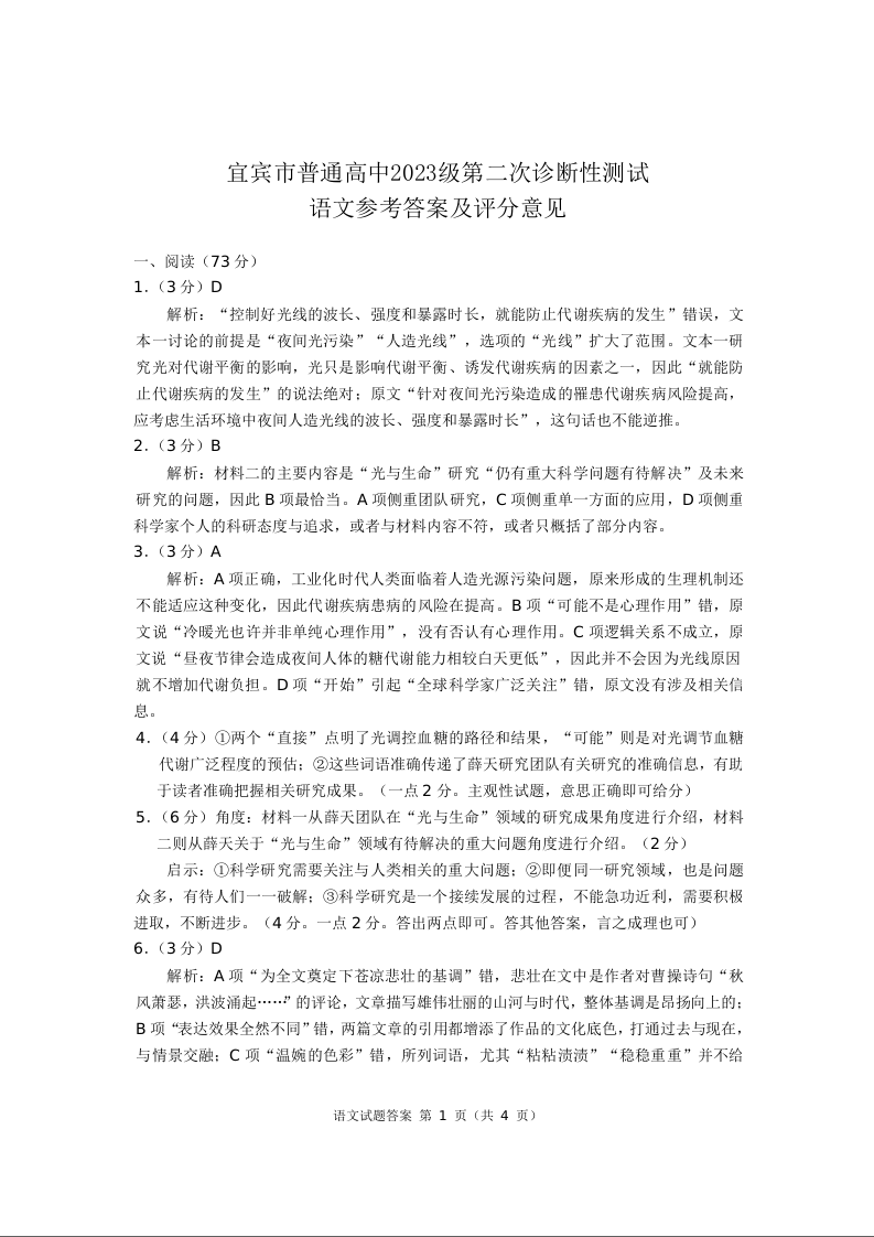 宜宾市普通高中2023级第二次诊断性测试 语文答案.docx