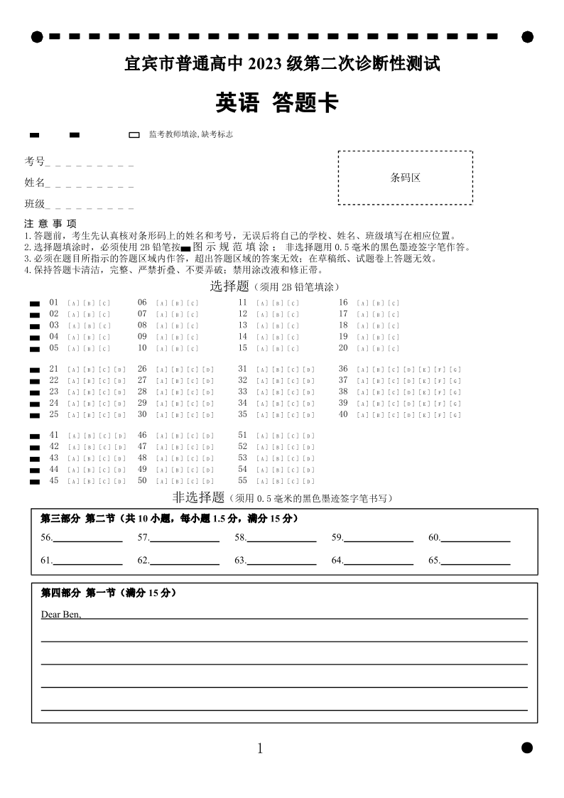 宜宾市普通高中2023级第二次诊断性测试 英语答题卡.pdf