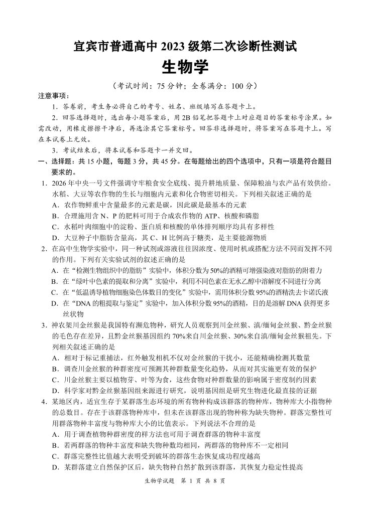 宜宾市普通高中2023级第二次诊断性测试 生物.pdf