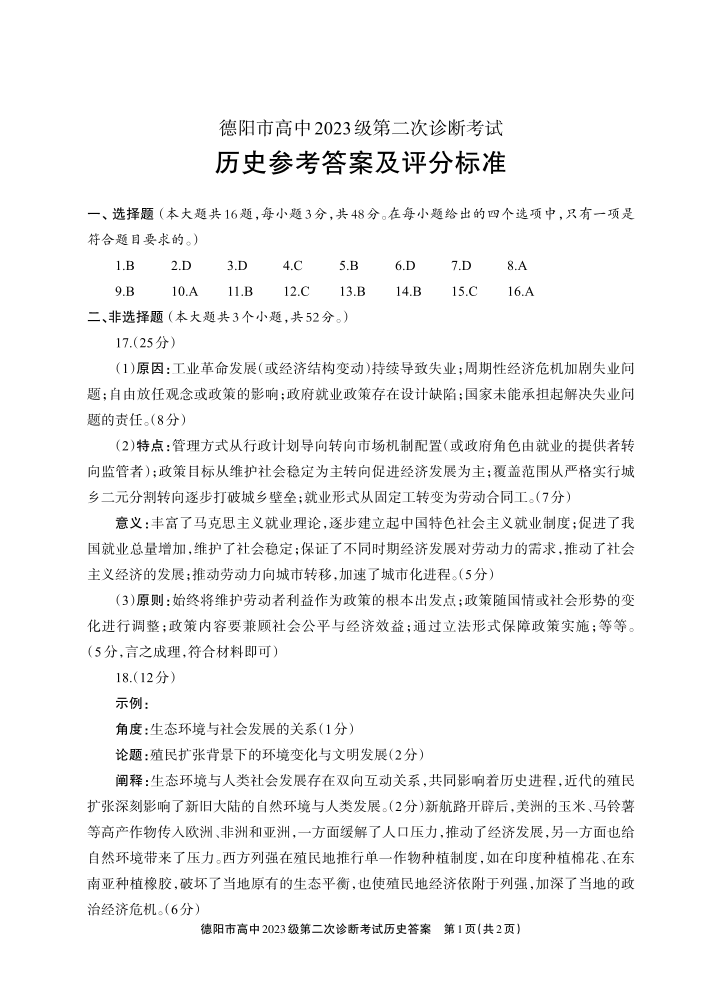 德阳市高中2023级第二次诊断考试 历史答案.pdf