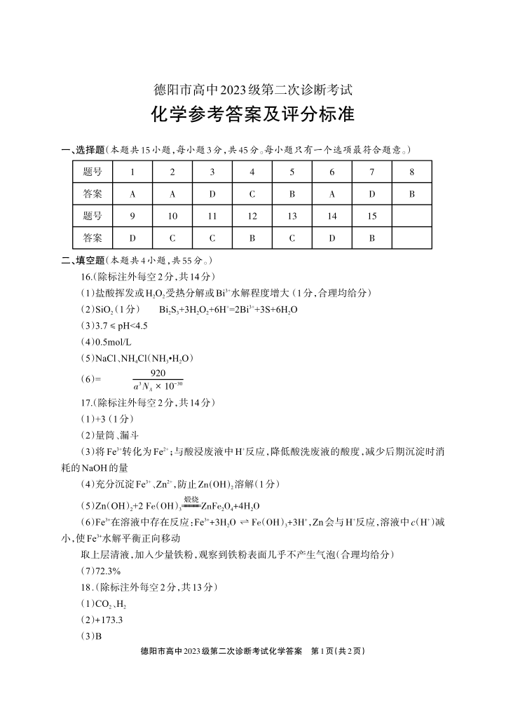 德阳市高中2023级第二次诊断考试 化学答案.pdf