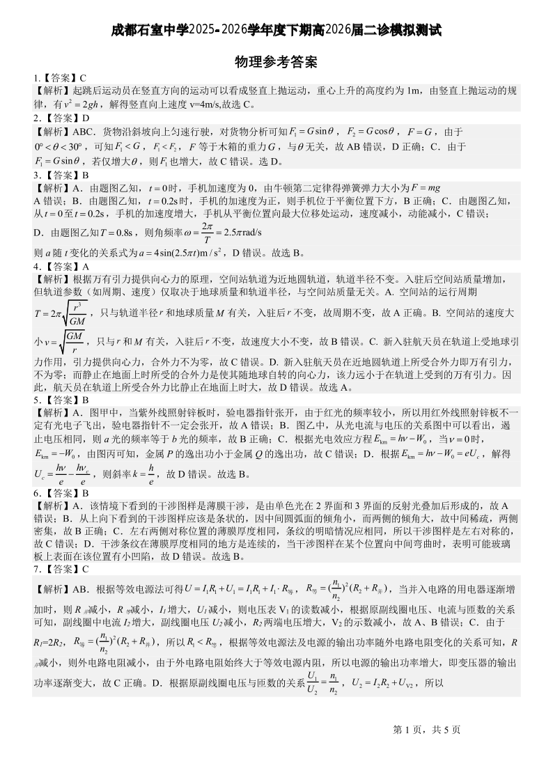 成都石室中学2025-2026学年度下学期高2026届二诊模拟考试 物理答案.pdf