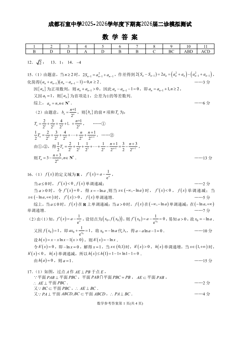 成都石室中学2025-2026学年度下学期高2026届二诊模拟考试 数学答案.pdf