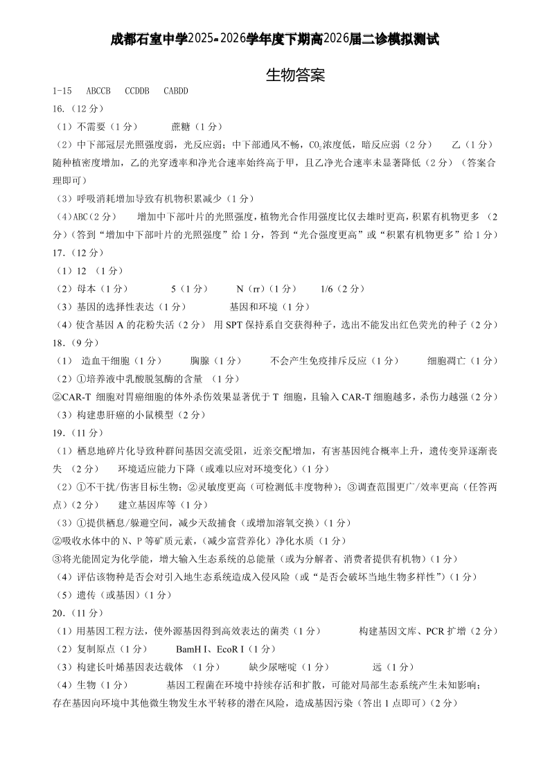 成都石室中学2025-2026学年度下学期高2026届二诊模拟考试 生物答案.pdf