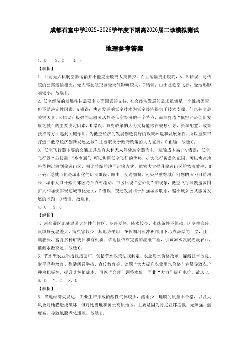 成都石室中学2025-2026学年度下学期高2026届二诊模拟考试 地理答案.pdf