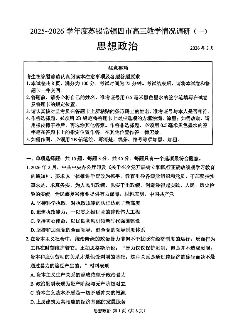 2025-2026学年度苏锡常镇四市高三教学情况调研(一)政治.pdf