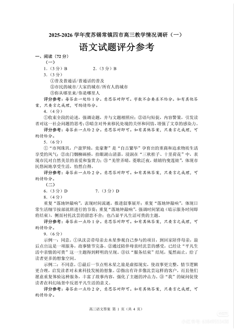 2025-2026学年度苏锡常镇四市高三教学情况调研(一)语文答案.pdf