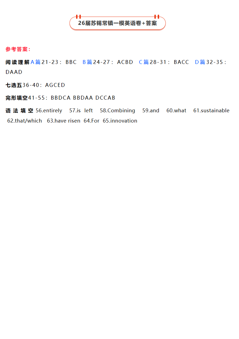 2025-2026学年度苏锡常镇四市高三教学情况调研(一)英语答案.pdf