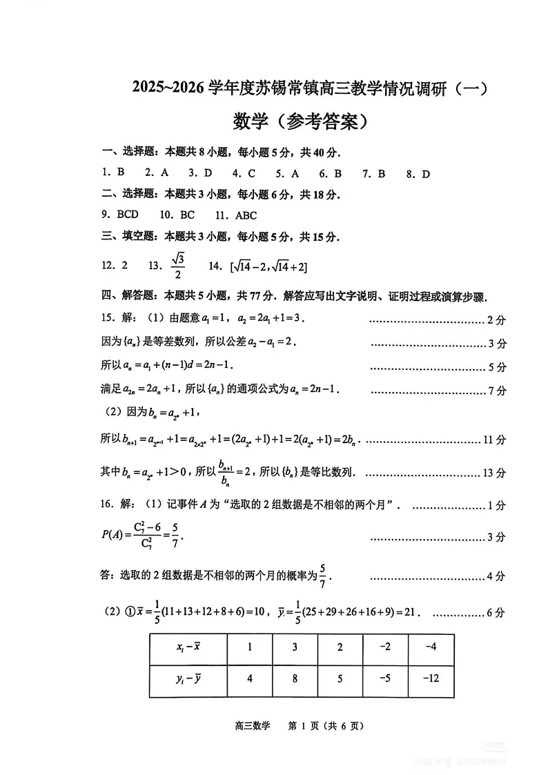 2025-2026学年度苏锡常镇四市高三教学情况调研(一)数学答案.pdf