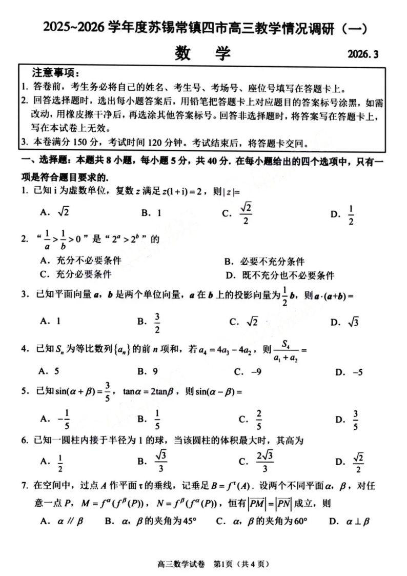 2025-2026学年度苏锡常镇四市高三教学情况调研(一)数学.pdf