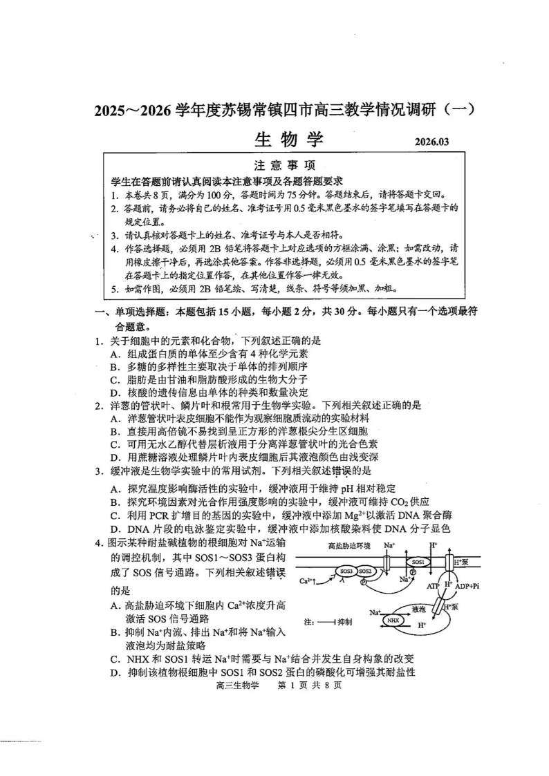 2025-2026学年度苏锡常镇四市高三教学情况调研(一)生物.pdf