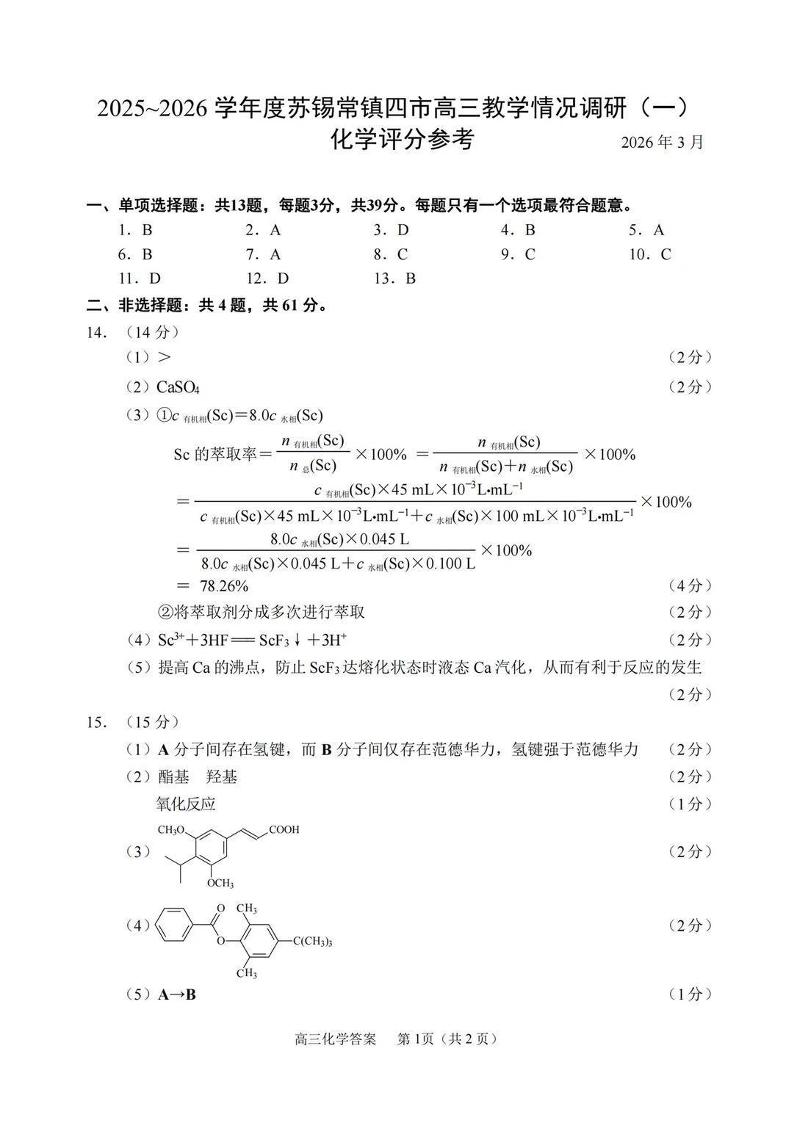 2025-2026学年度苏锡常镇四市高三教学情况调研(一)化学答案.pdf
