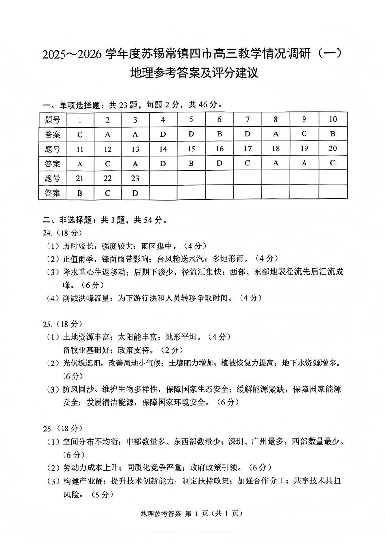 2025-2026学年度苏锡常镇四市高三教学情况调研(一)地理答案.pdf