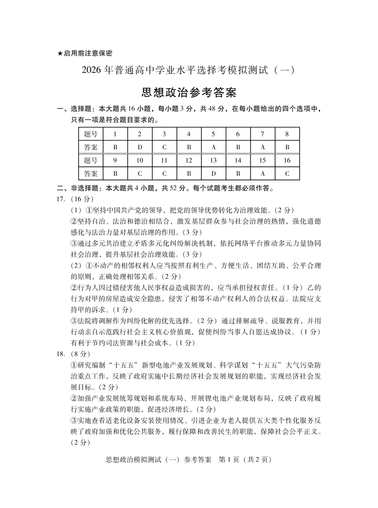 2026年普通高等学校招生全国统一考试模拟测试(一)政治答案.pdf