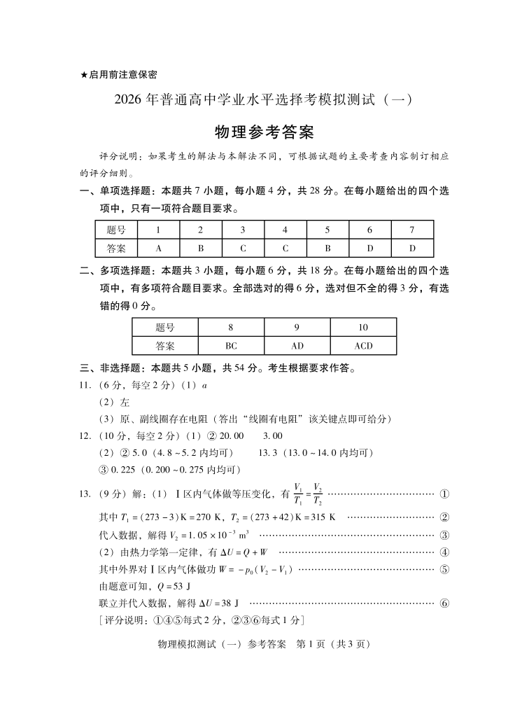 2026年普通高等学校招生全国统一考试模拟测试(一)物理答案.pdf