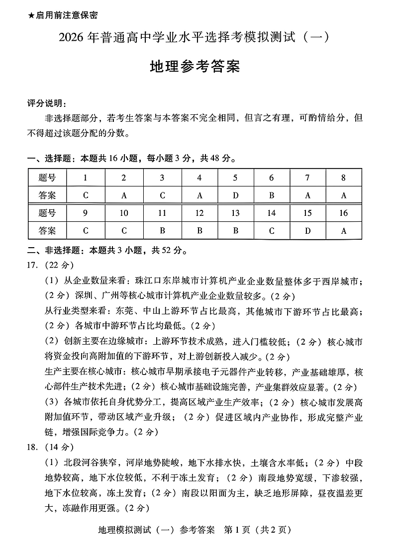 2026年普通高等学校招生全国统一考试模拟测试(一)地理答案.pdf