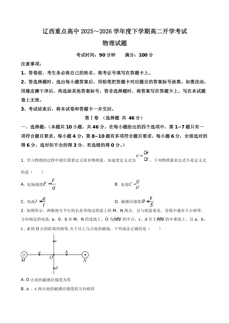 辽宁省辽西重点高中2025-2026学年高二下学期开学联考 物理.docx
