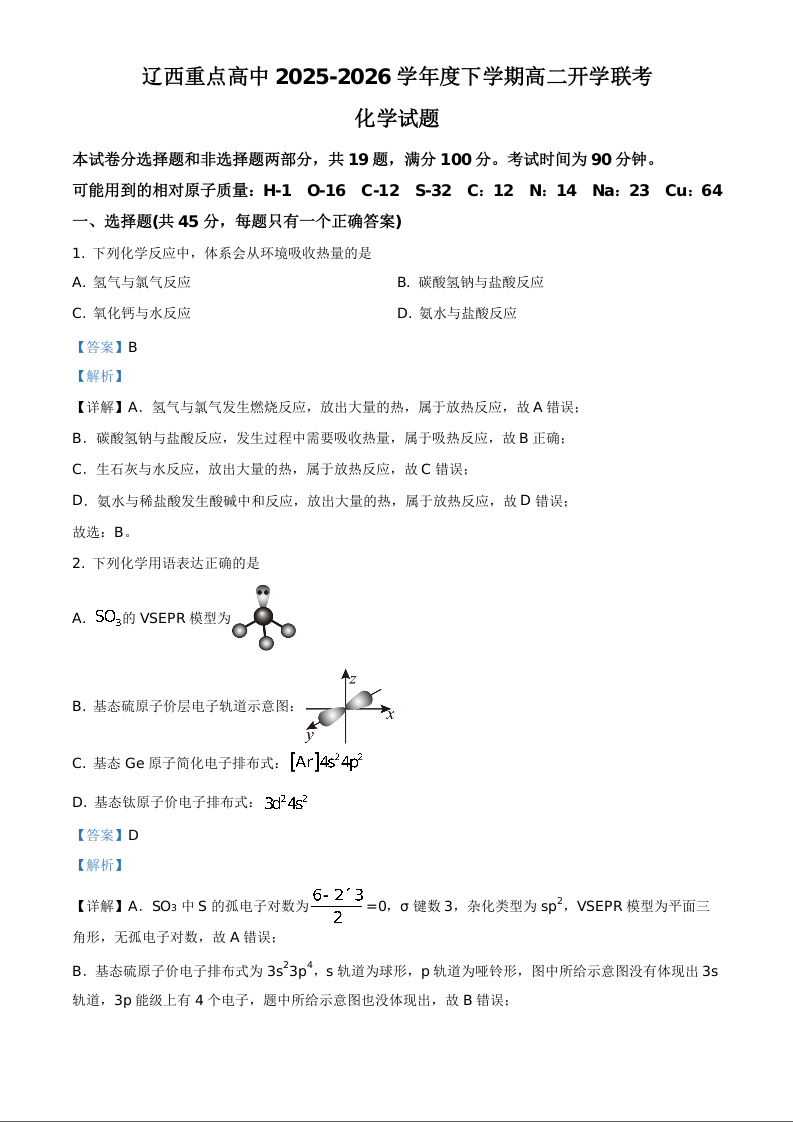辽宁省辽西重点高中2025-2026学年高二下学期开学联考 化学答案.docx