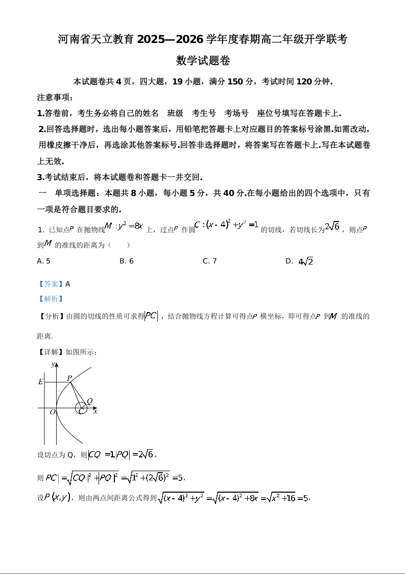 河南省周口市天立教育2025-2026学年高二下学期开学考试 数学答案.docx