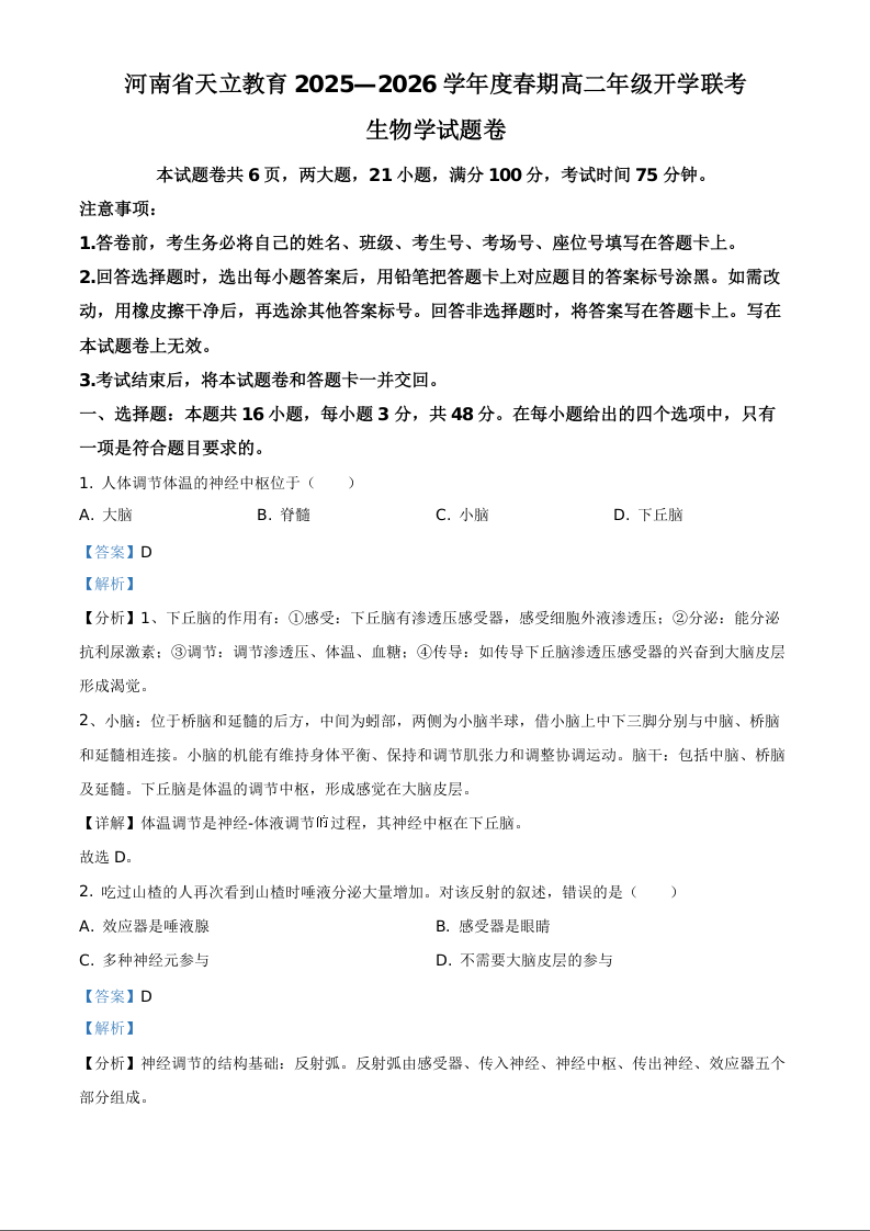 河南省周口市天立教育2025-2026学年高二下学期开学考试 生物答案.docx