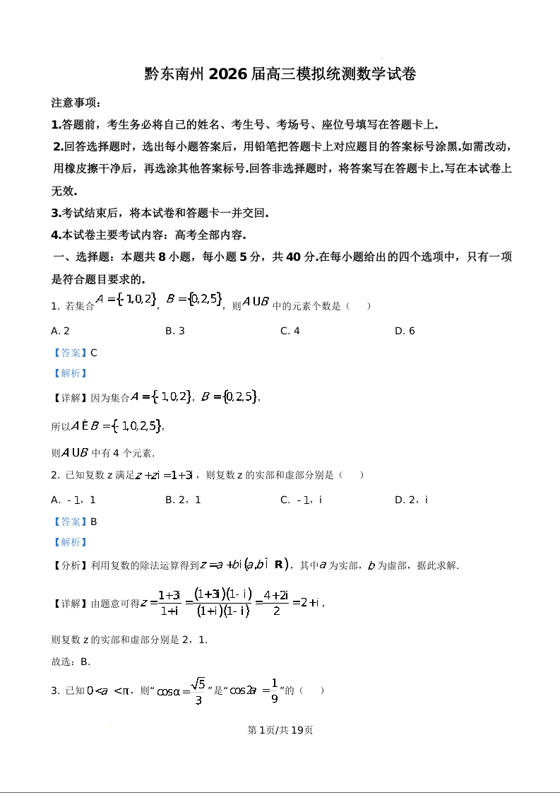贵州省黔东南州2026届高三3月模拟统测 数学答案.docx