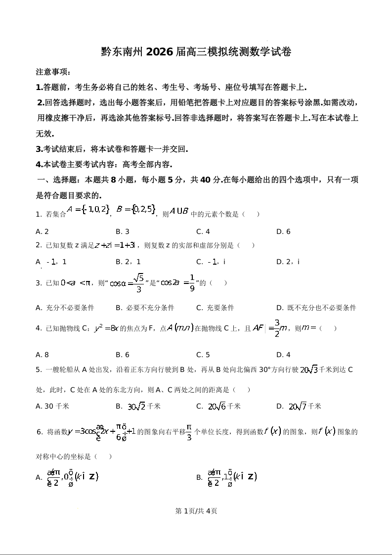 贵州省黔东南州2026届高三3月模拟统测 数学.docx
