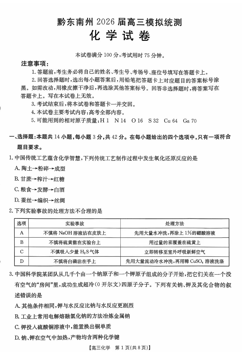 贵州省黔东南州2026届高三3月模拟统测 化学试题(含答案).pdf