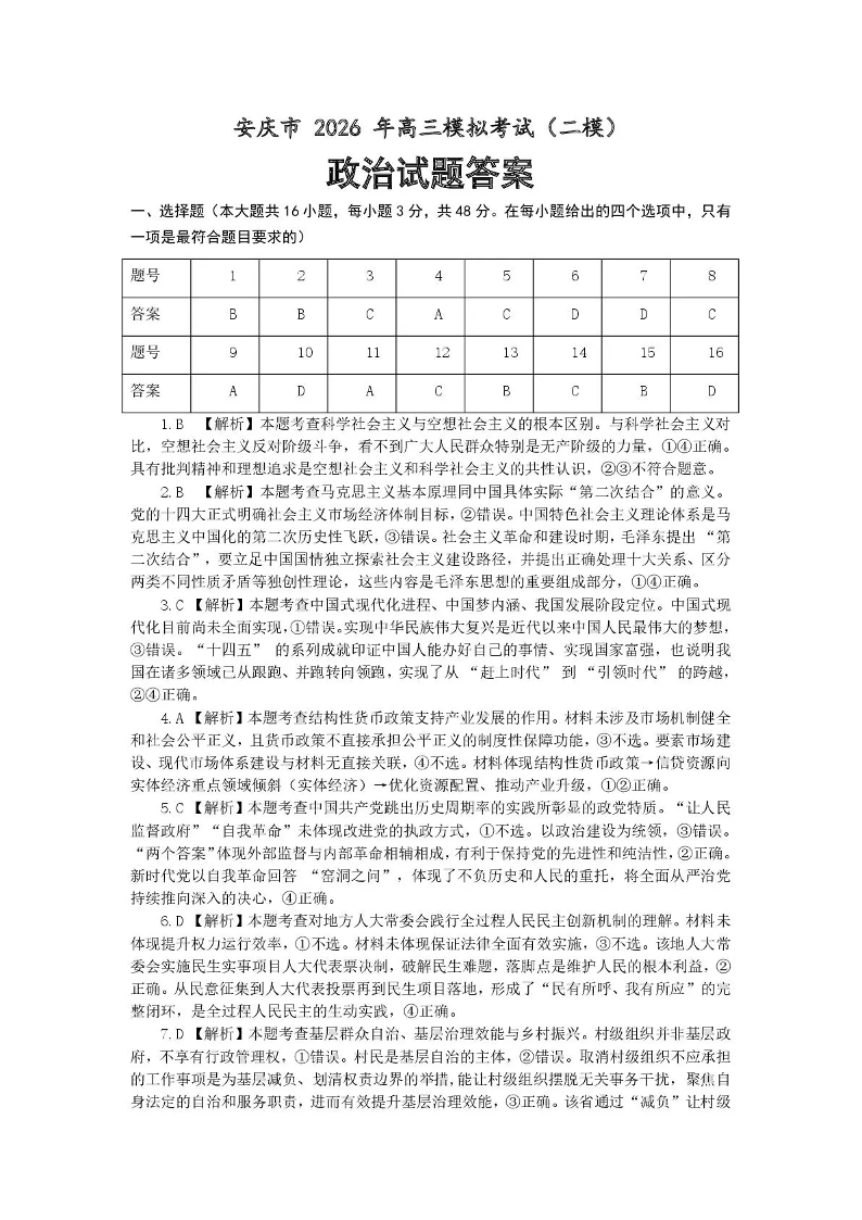 安庆市2026年高三模拟考试(二模)政治答案.pdf