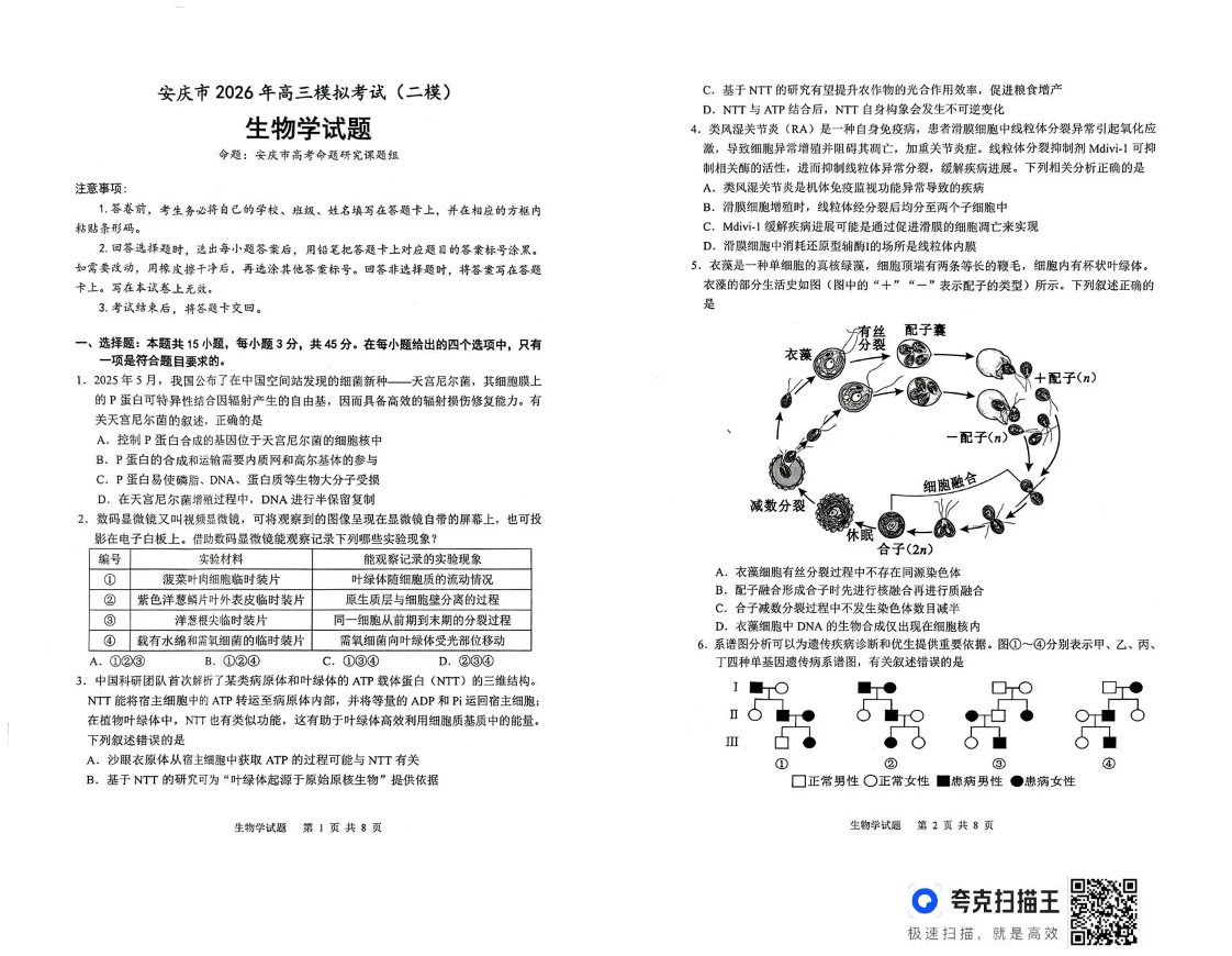 安庆市2026年高三模拟考试(二模)生物.pdf