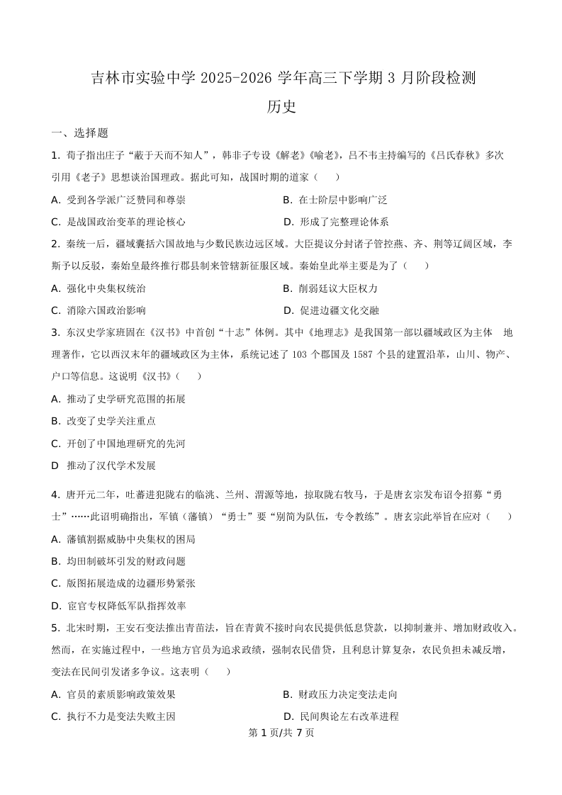 吉林省实验中学2026届高三下学期3月阶段检测 历史.docx