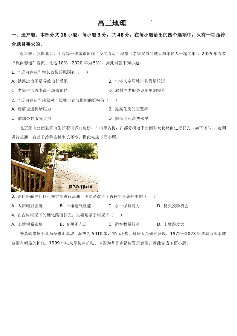 吉林通化市梅河口市第五中学2026届高三下学期一模 地理试题(含答案).docx